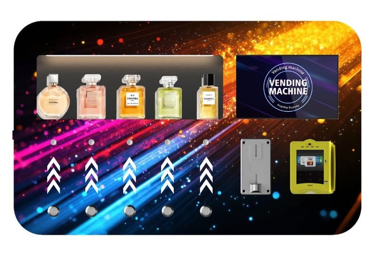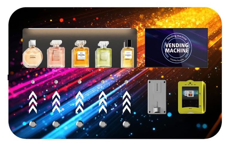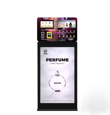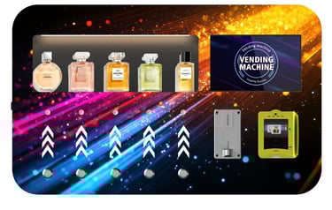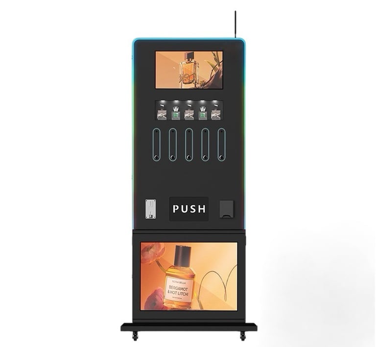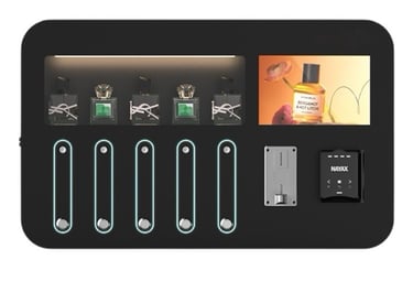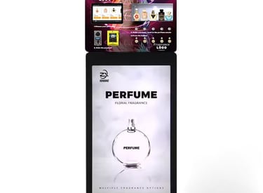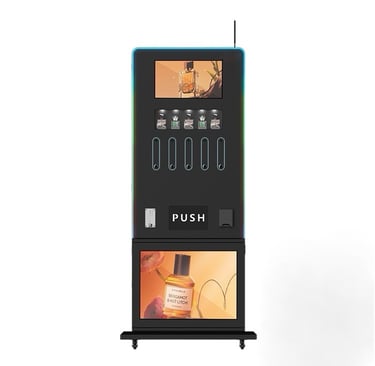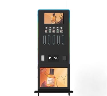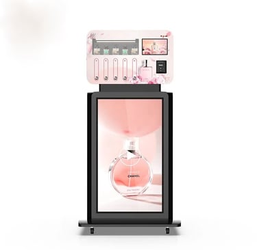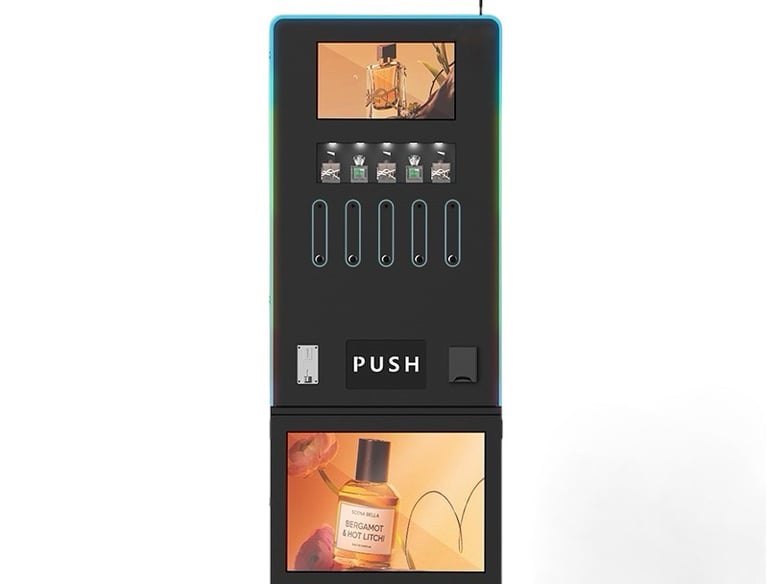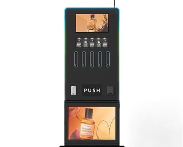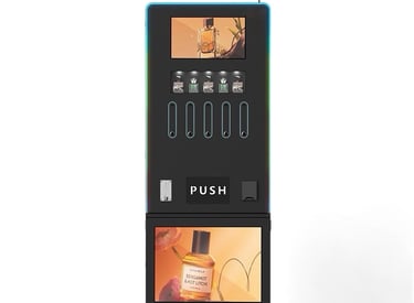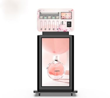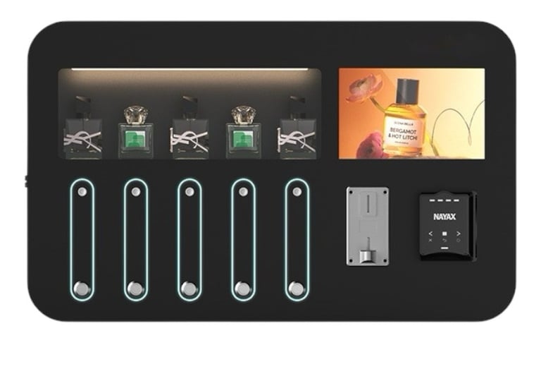 Five high end fragrances showcased for on the spot selection. Elegant presentation designed to enhance visual appeal. Gently guide your wrist or neck to the selected spray zone.